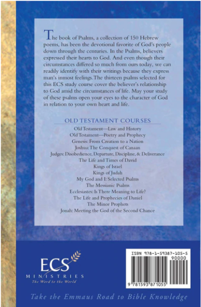 The book of Psalms, a collection of 150 Hebrew poems, has been the devotional favorite of God’s people down through the centuries. In the Psalms, believers expressed their hearts to God. And even though their circumstances differed so much from ours today, we can readily identify with their writings because they express man’s inmost feelings.The thirteen psalms selected for this ECS study course cover the believer’s relationship to God amid the circumstances of life. May your study of these psalms open your eyes to the character of God in relation to your own heart and life.